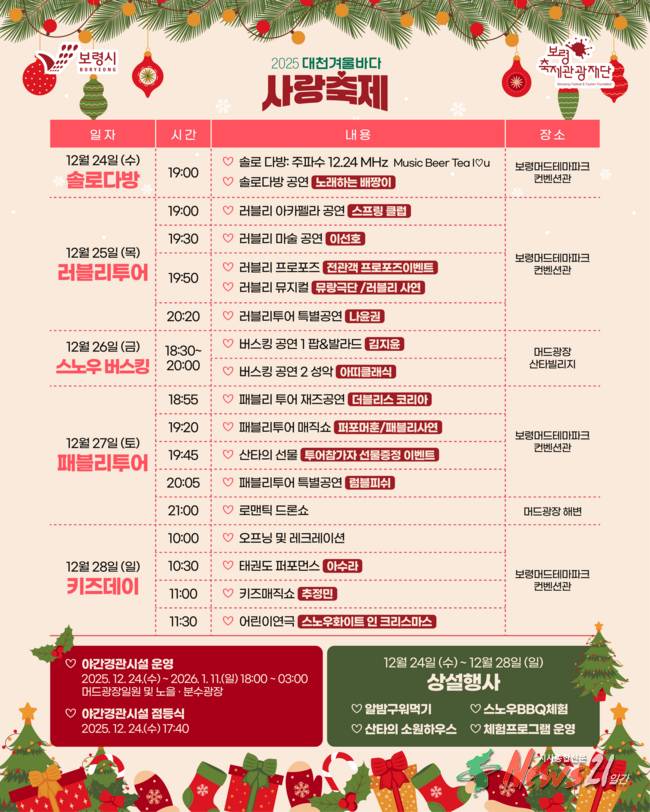 26일에는 머드광장 산타빌리지에서 감성 가득한 스노우 버스킹 데이가 펼쳐진다. 27일에는 가족 단위 관광객을 위한 패블리투어가 운영되고, 저녁에는 럼블피쉬 공연과 겨울바다 위를 수놓는 로맨틱 드론쇼가 축제의 절정을 장식한다. 마지막 날인 28일은 어린이를 위한 키즈데이로 어린이 연극과 매직쇼, 태권도 퍼포먼스가 이어진다.
