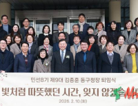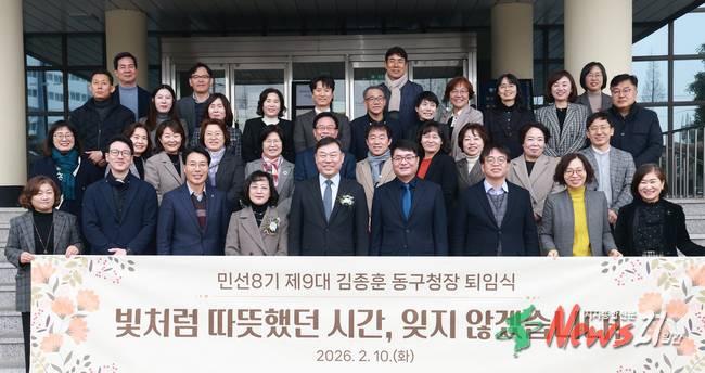 동구청[뉴스21일간=임정훈] 울산 동구(구청장 김종훈)는 2월 10일(화) 오전 10시 20분 구청장실에서 민선 8기 제9대 울산 동구청장 퇴임식을 개최했다. 이번 퇴임식은 형식적인 의전 중심의 행사에서 벗어나, 취임 당시부터 강조해 온 주민 참여와 소통의 가치를 마지막까지 이어가는 자리로 마련됐다. 김종훈 동구청장은 2022년 7월 취임식...
