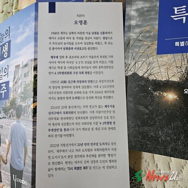 ▲ 사진=오영훈지사가 출간한 책의 책 날개. 오지사에 관한 소개가 실려 있다. 3월2일 봄비가 쏟아지는 가운데 제주한라대학교 한라컨벤션센터에서 에세이 '오영훈이 말하는 제주 정책 3부작' 출판기념회를 개최했고. 삼천여명이 찾아 붐비고 성황을 이루었다.